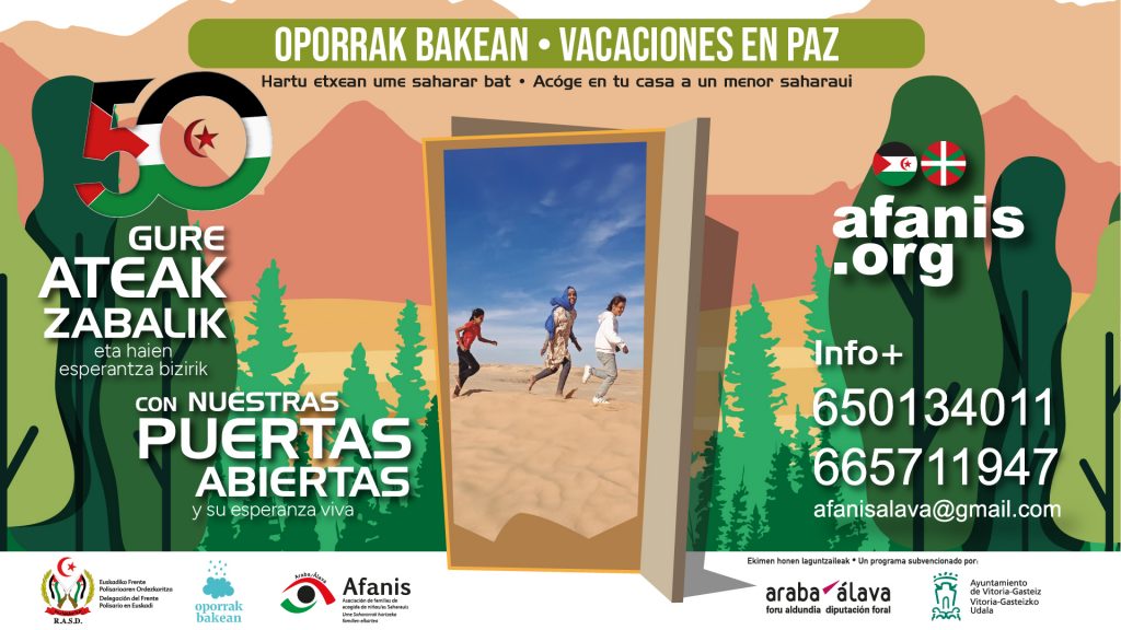 El programa ‘Oporrak bakean-Vacaciones en paz’, que pretende movilizar a familias alavesas para que acojan el próximo verano a niños y niñas procedentes de los campamentos de población saharaui situados en Tinduf (Argelia), busca dar un respiro a 40 menores los próximos meses de julio y agosto.